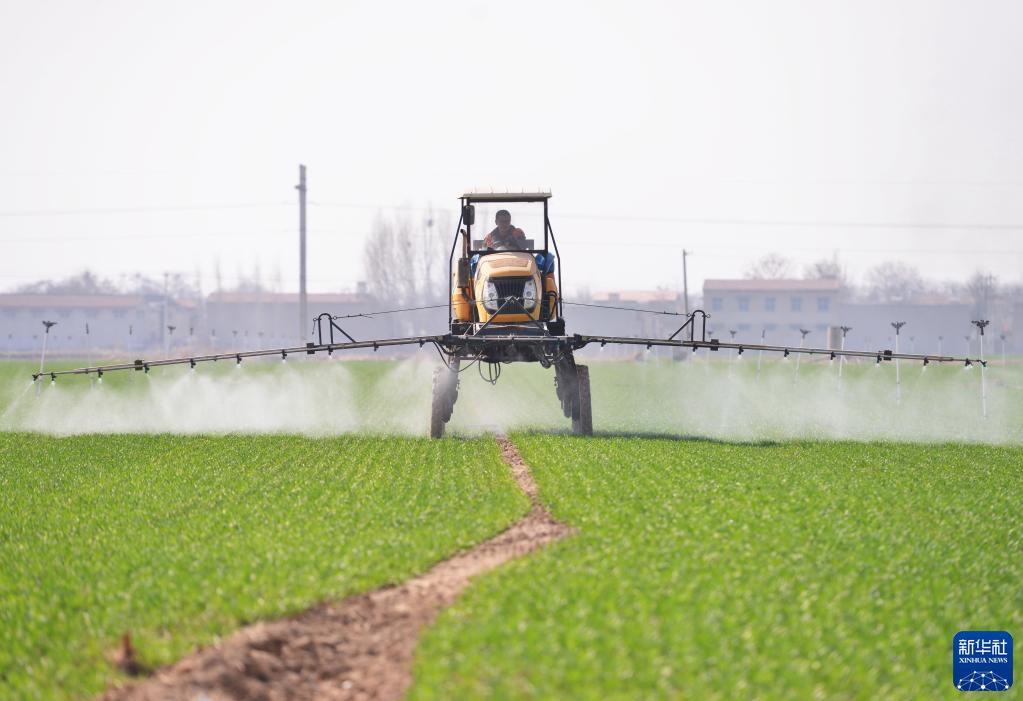 3月14日,河北省晉州市槐樹(shù)鎮北白水村一家農業(yè)合作社的社員在操作機械設備給冬小麥噴灑農藥。