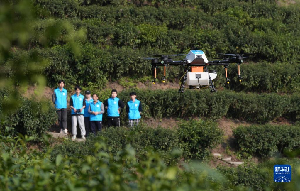 3月14日,在重慶市北碚區天府鎮代家村青峰茶場(chǎng),來(lái)自重慶海聯(lián)職業(yè)技術(shù)學(xué)院無(wú)人機專(zhuān)業(yè)的學(xué)生在練習植保無(wú)人機飛防作業(yè)。