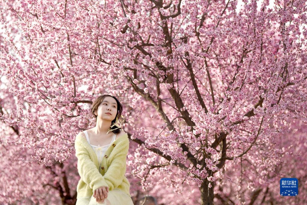 3月14日,游人在西安大明宮國家遺址公園內賞花留影。
