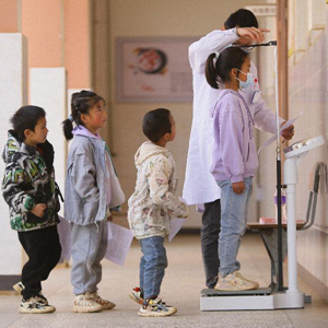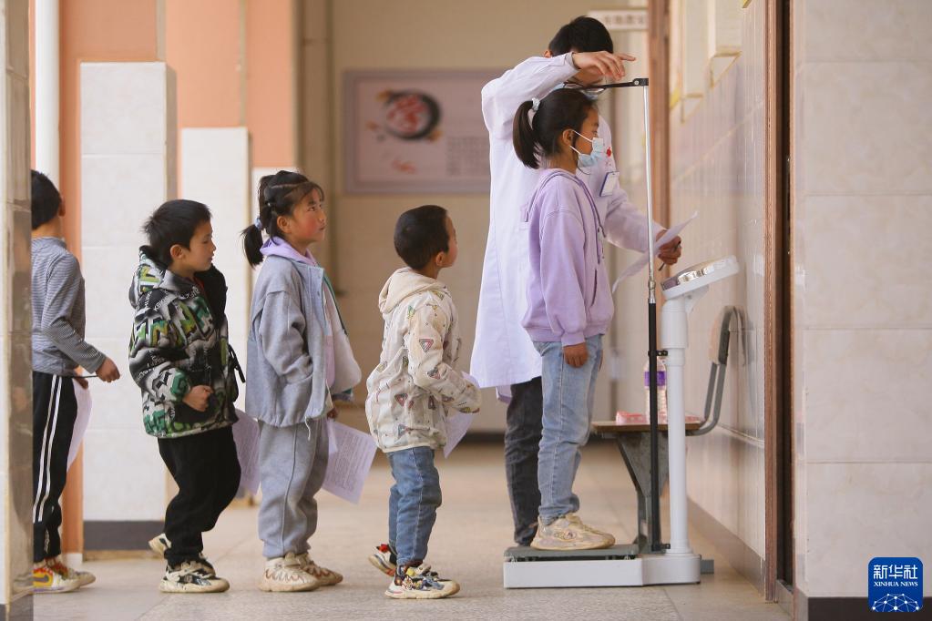 3月14日,在曲靖市沾益區白水鎮崗路小學(xué),醫護人員為學(xué)生測量身高體重。
