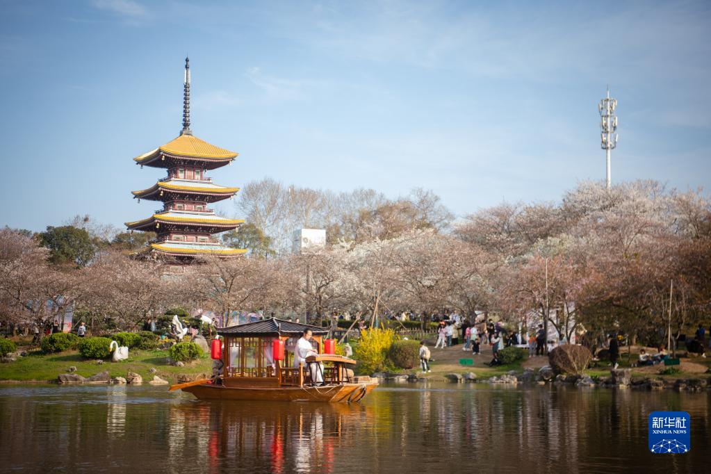 近日,湖北武漢東湖櫻園的櫻花競相綻放,吸引眾多游客前來(lái)踏青賞花,樂(lè )享春光。
