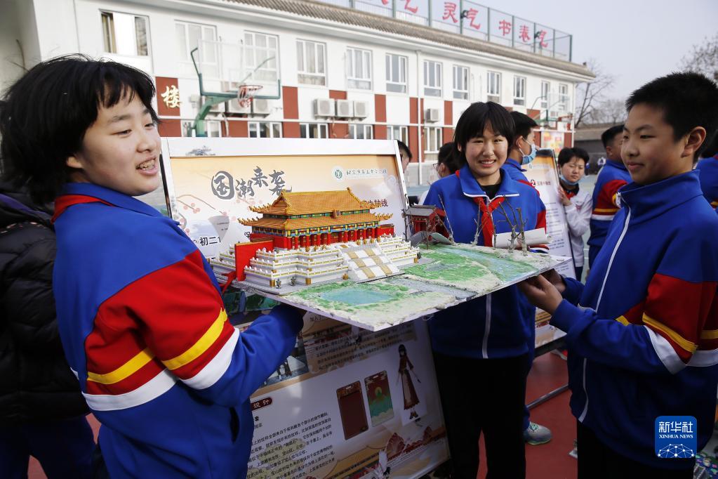 3月14日,中學(xué)生展示參與設計制作的“北京中軸線(xiàn)”景觀(guān)沙盤(pán)作品。