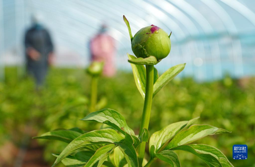 3月14日,在山東省菏澤市牡丹區黃堽鎮,一朵芍藥花蕾已成長(cháng)到鮮切花采摘標準。
