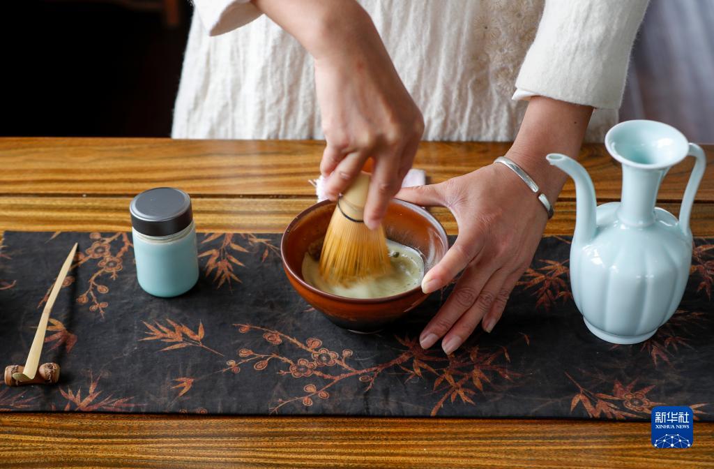 3月9日,在安徽省黃山市屯溪區孫王閣的琪花社茶樓,茶藝師姜克美為顧客制作“花式點(diǎn)茶”。