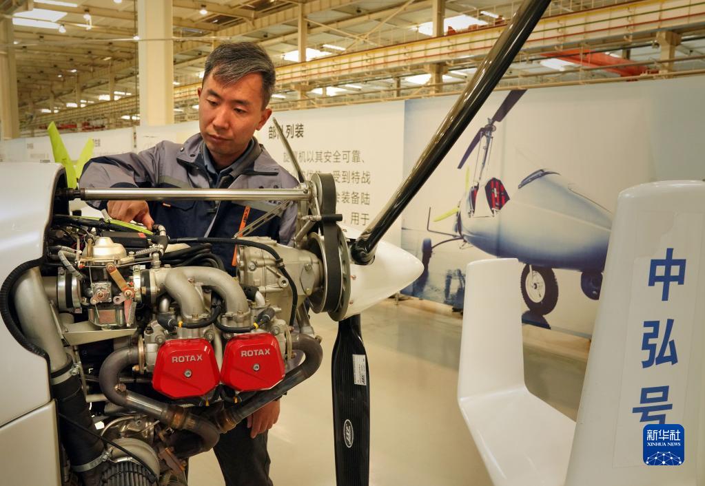 3月14日,在位于洛陽(yáng)市的生產(chǎn)車(chē)間內,楊世誼對裝配后的旋翼機發(fā)動(dòng)機進(jìn)行檢查。