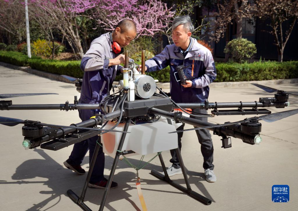 3月14日,在位于洛陽(yáng)市的生產(chǎn)車(chē)間外,楊世誼(右)和員工在無(wú)人機起飛前進(jìn)行設備檢查。