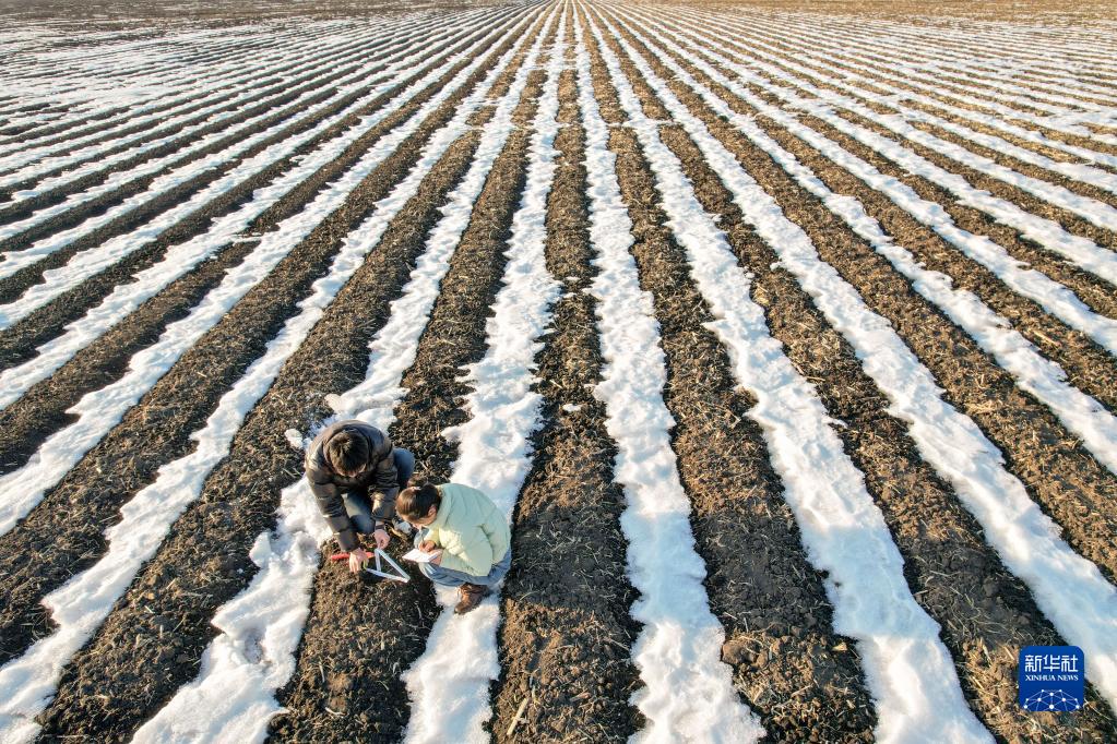 3月14日,在北大荒集團建設農場(chǎng)有限公司農業(yè)科技園區試驗田,孫凡紅(右)與同事一起查看融雪期土壤融化深度情況(無(wú)人機照片)。
