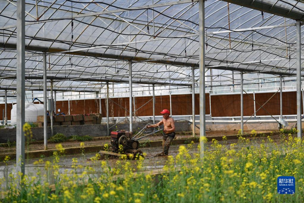 3月15日,在向陽(yáng)紅現代農業(yè)智能化集中育秧工廠(chǎng),農民操作手扶拖拉機翻耕土地。