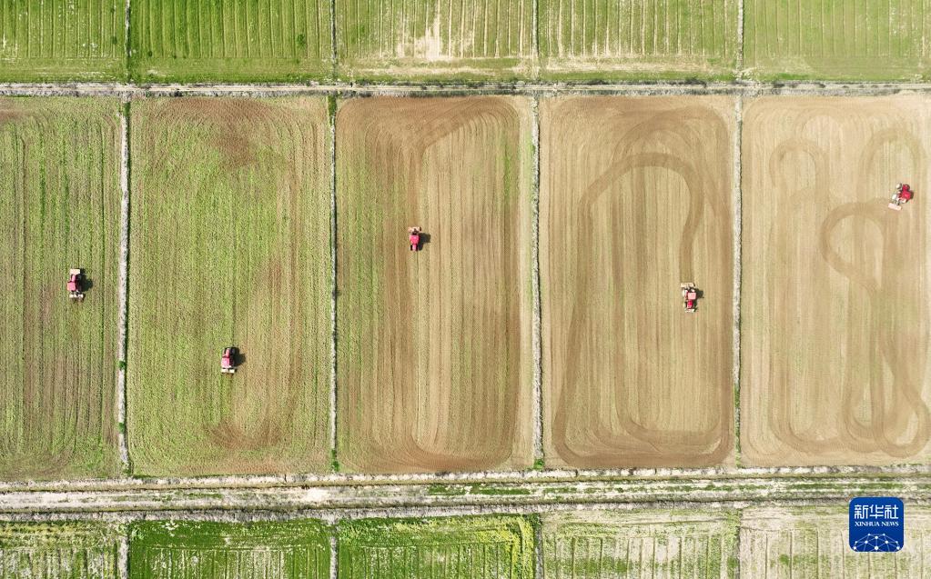 在江西省南昌縣大田農社,農民駕駛農機在稻田里耕作(3月15日攝,無(wú)人機照片)。