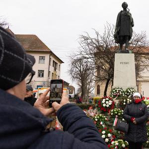 3月15日,在匈牙利小克勒什,民眾在裴多菲雕像前拍照留念。