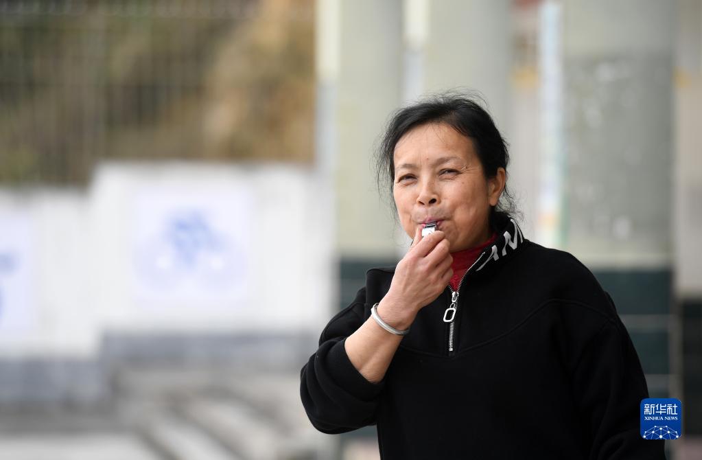 廣西金秀瑤族自治縣忠良鄉山界教學(xué)點(diǎn)的教師陶鳳英吹哨子催促學(xué)生進(jìn)教室上課(3月15日攝)。