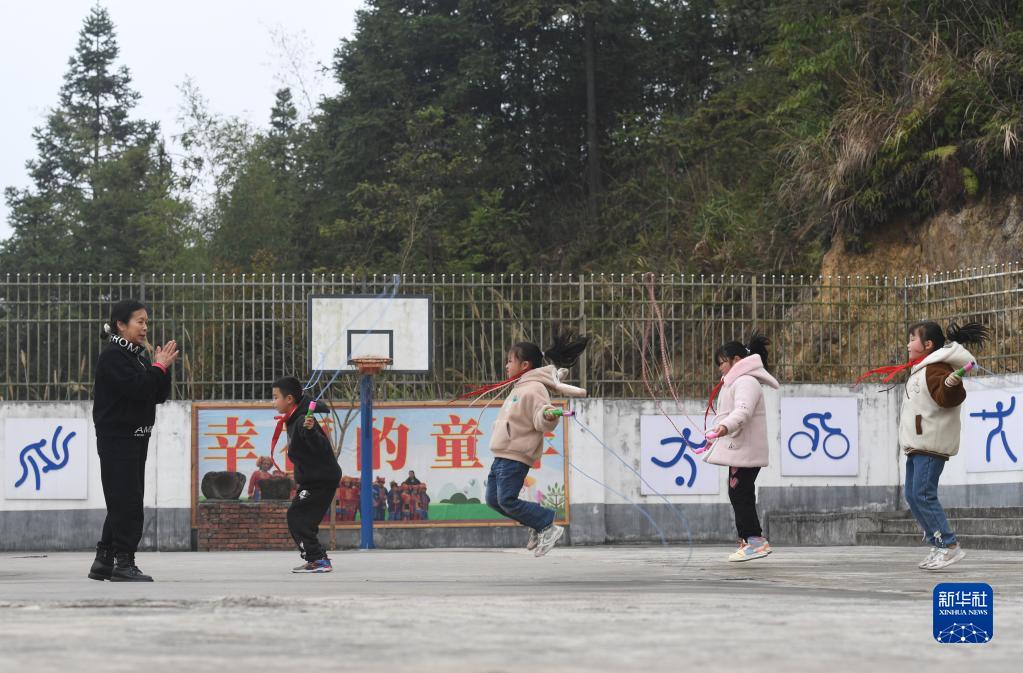 廣西金秀瑤族自治縣忠良鄉山界教學(xué)點(diǎn)的教師陶鳳英在課間幫跳繩的學(xué)生數數(3月15日攝)。
