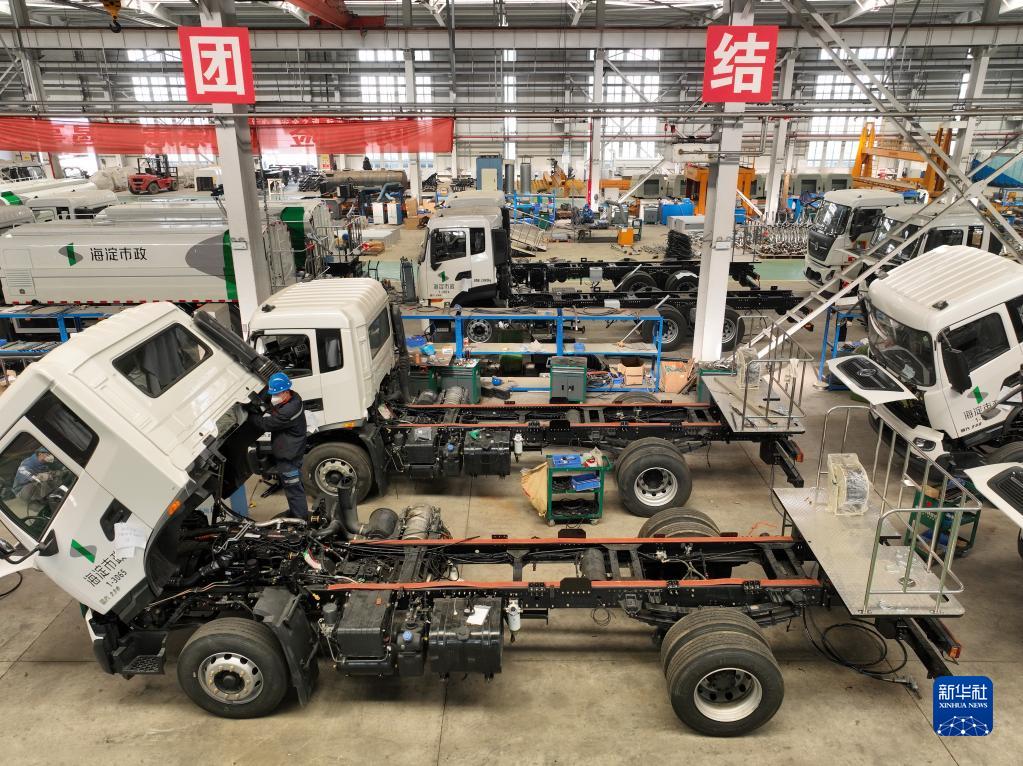 3月15日,在位于樂(lè )亭經(jīng)濟開(kāi)發(fā)區的北京環(huán)衛集團環(huán)衛裝備樂(lè )亭有限公司,工人在車(chē)間內工作(無(wú)人機照片)。