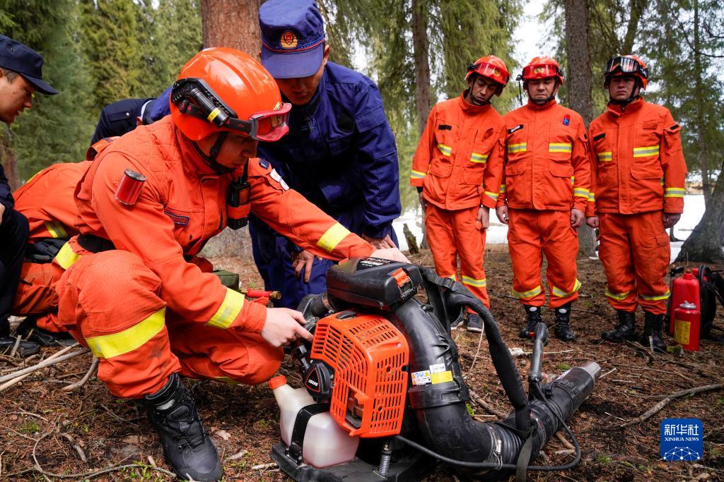 3月15日,鞏留縣森林消防大隊指戰員(前左)在向新疆西天山國家級自然保護區森林草原應急消防分隊成員介紹如何使用滅火工具。