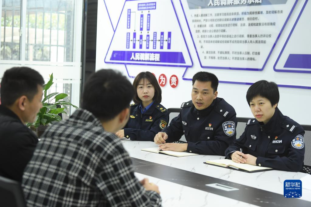 3月16日,在位于湖州吳興區八里店鎮的警源聯(lián)治工作站,民警聯(lián)合行政執法工作人員為群眾進(jìn)行調解。