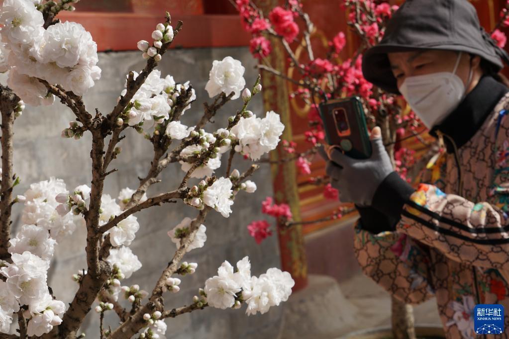3月16日,游客在故宮內欣賞碧桃花。