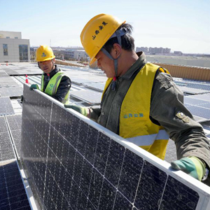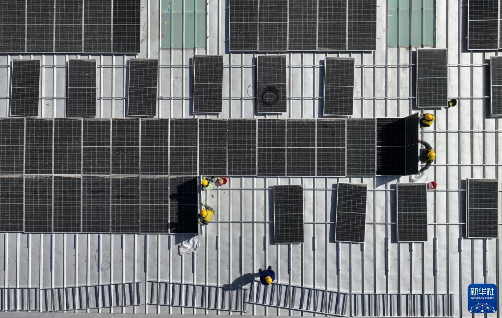 3月16日,工人在唐山市蘆臺經(jīng)濟開(kāi)發(fā)區一家企業(yè)廠(chǎng)房屋頂上安裝太陽(yáng)能光伏發(fā)電板(無(wú)人機照片)。