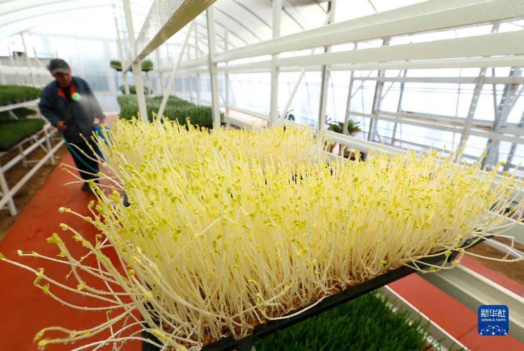 3月16日,在山東省青島市即墨區北安街道天郁芬芳農場(chǎng),農民在管理芽苗菜。