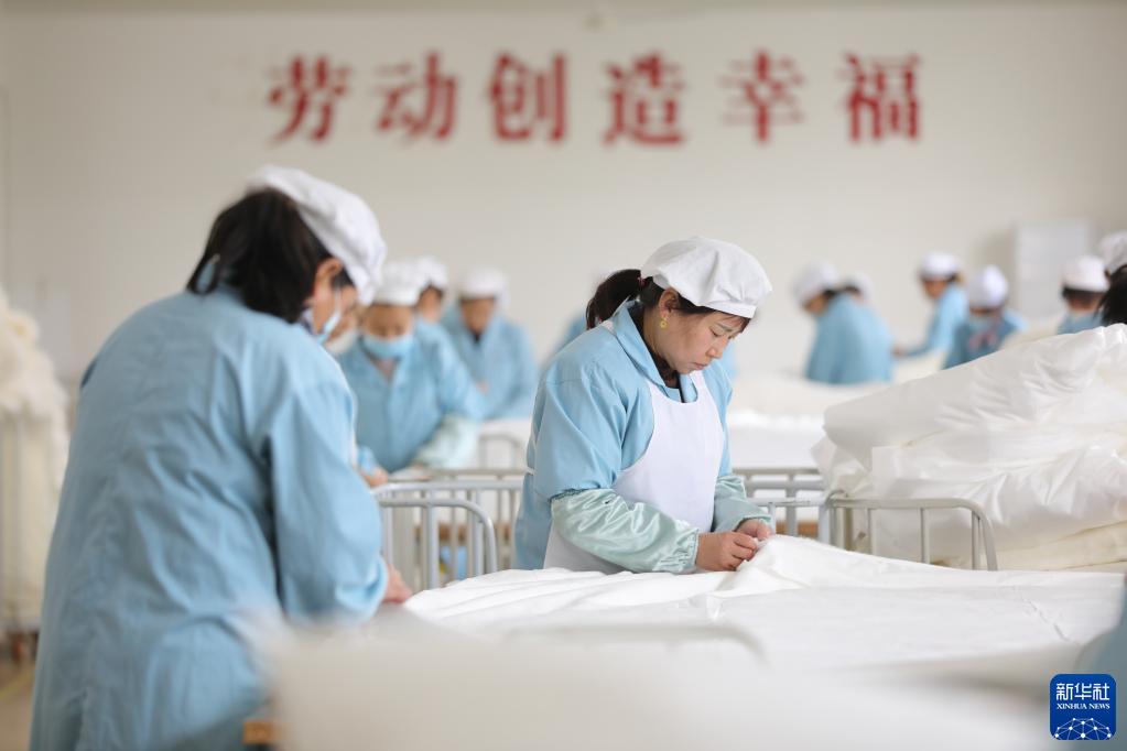 3月16日,在蘇州太湖雪絲綢股份有限公司生產(chǎn)車(chē)間內,工人在拉制蠶絲被。