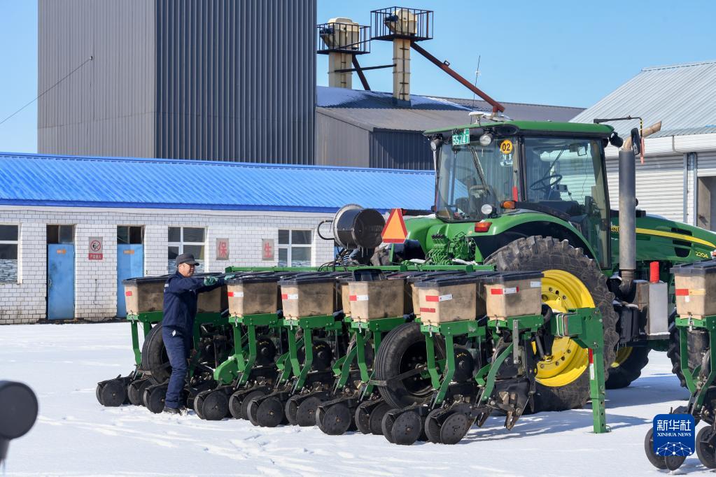 3月16日,在北大荒集團建設農場(chǎng)有限公司第四管理區,農機技術(shù)員在檢修農機具。