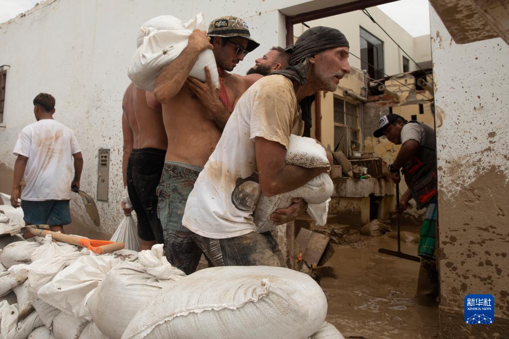 3月16日,人們在秘魯首都利馬南部的蓬塔赫爾莫薩地區建造臨時(shí)堤壩,以阻擋暴雨造成的泥石流。