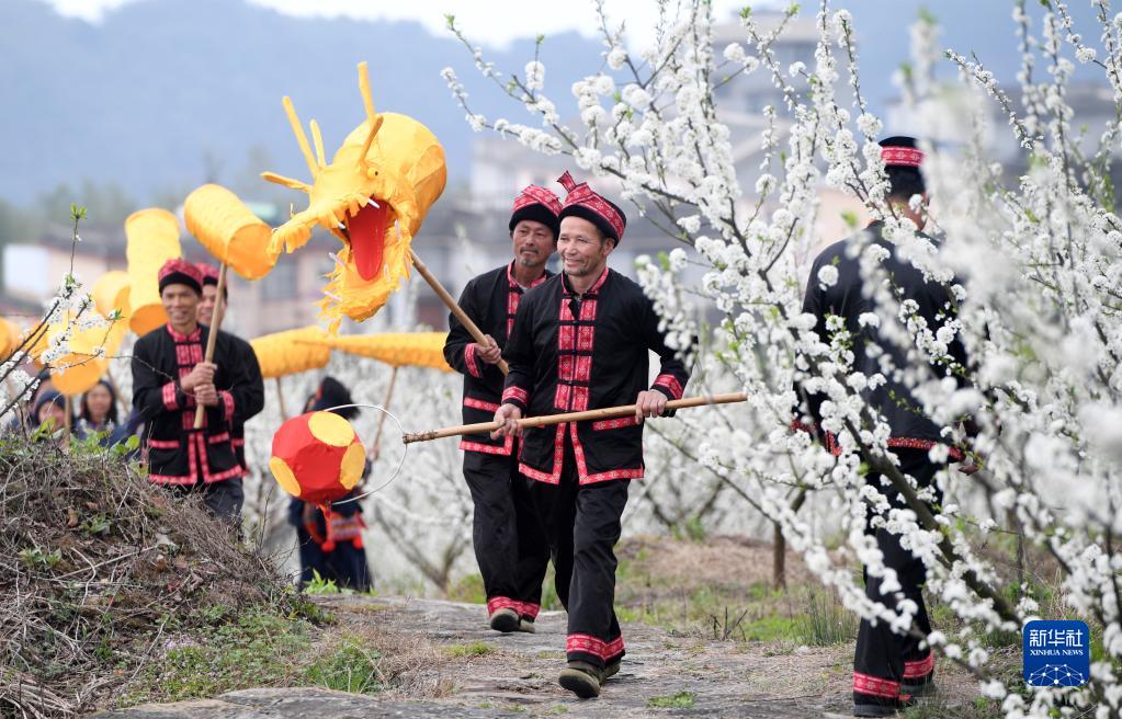 3月17日,在廣西金秀瑤族自治縣忠良鄉巴勒村,村民在舞龍。