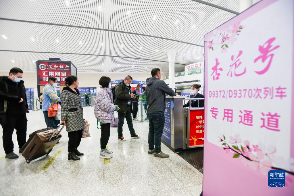 3月17日,乘客在烏魯木齊站“杏花號”高鐵列車(chē)專(zhuān)用通道檢票乘車(chē)。