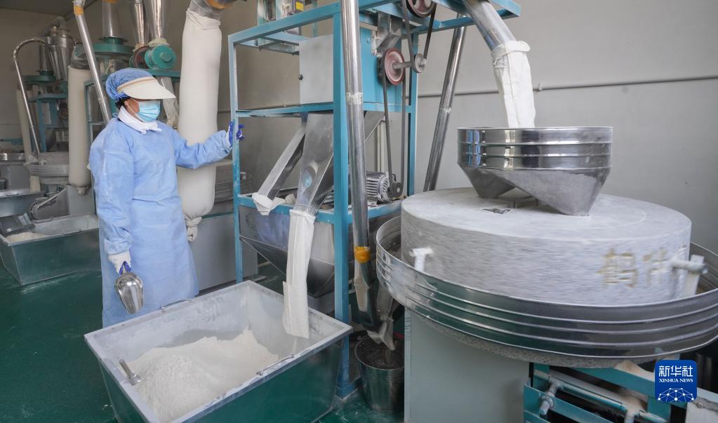 3月17日,在山東省鄒平市西董街道郭家峪村鶴伴磨坊,工作人員在生產(chǎn)石磨面粉。