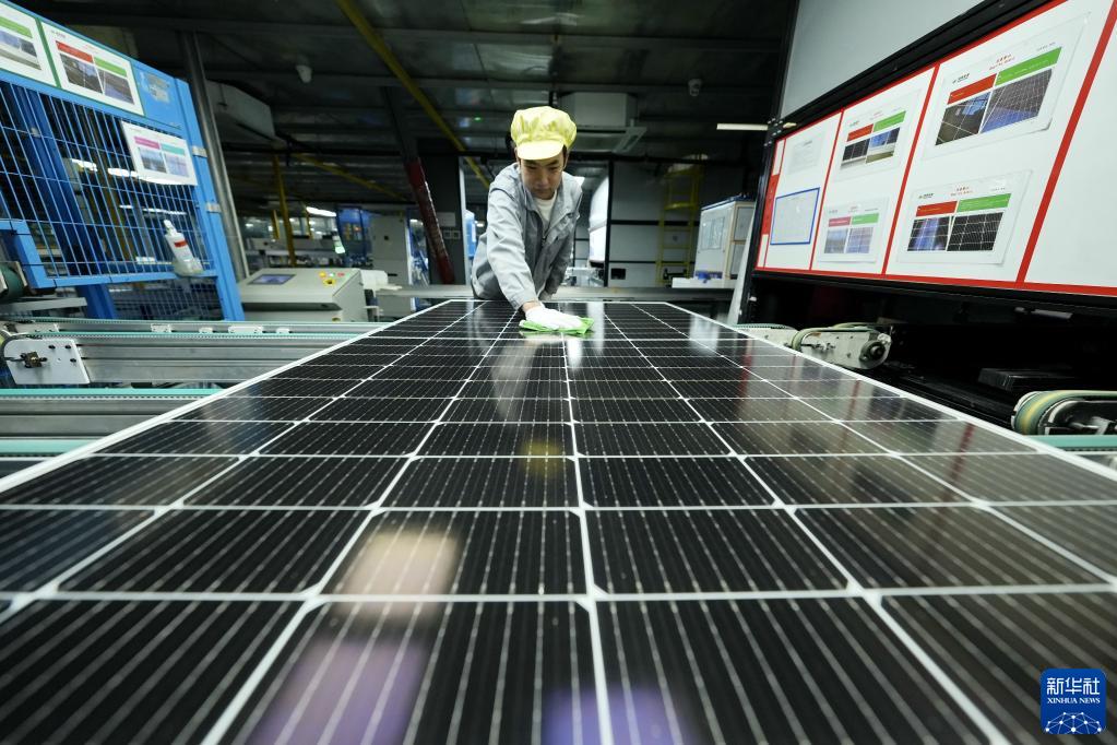 3月18日,河北省玉田縣一家光伏設備生產(chǎn)企業(yè)的工人在清潔光伏板產(chǎn)品。