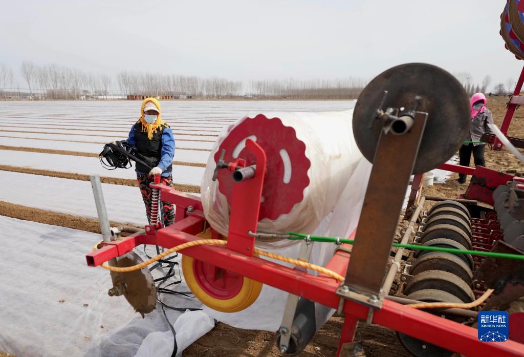 3月18日,唐山市曹妃甸區第六農場(chǎng)一家農業(yè)合作社的社員在使用機械設備播種。