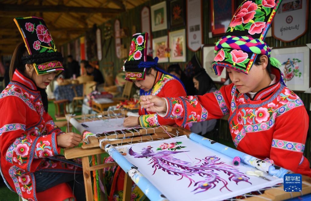 3月18日,寧強羌族刺繡的非遺傳承人在2023中國最美油菜花海漢中旅游文化節的非遺展區展示技藝。