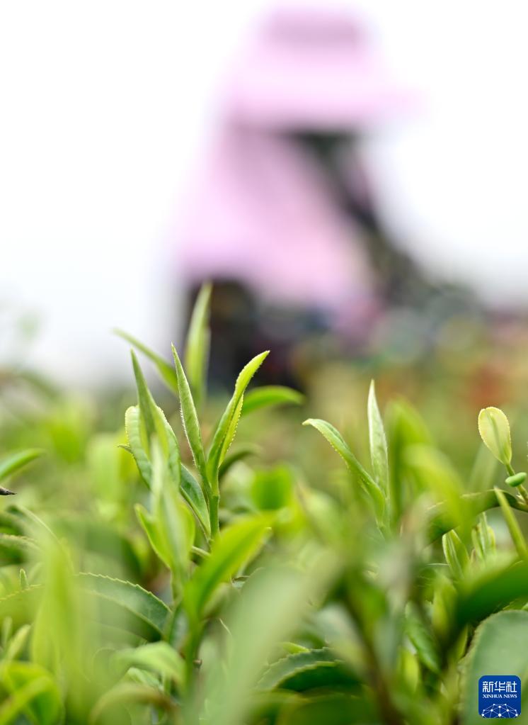 3月18日,茶農在廣西柳城縣伏虎華僑農場(chǎng)茶園里采摘春茶。