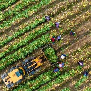 3月18日,余姚市泗門(mén)鎮農民在田間收割芥菜(無(wú)人機照片)。