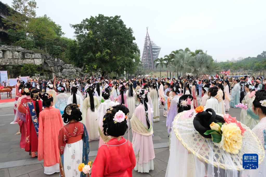 3月18日,身著(zhù)古風(fēng)服飾的人們在廣西南寧園博園參加花朝盛典活動(dòng)。