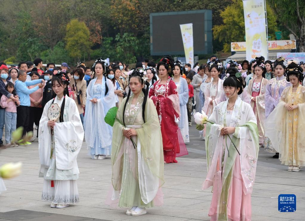 3月18日,身著(zhù)古風(fēng)服飾的人們在廣西南寧園博園參加花朝盛典活動(dòng)。