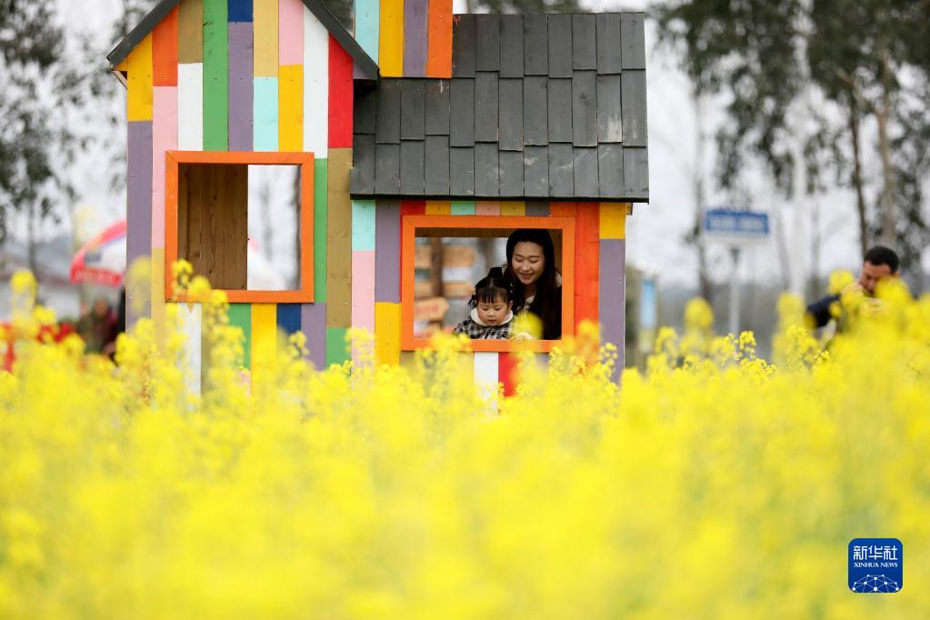 3月18日,游客在湖南省資興市蓼江鎮油菜花田賞景游玩。