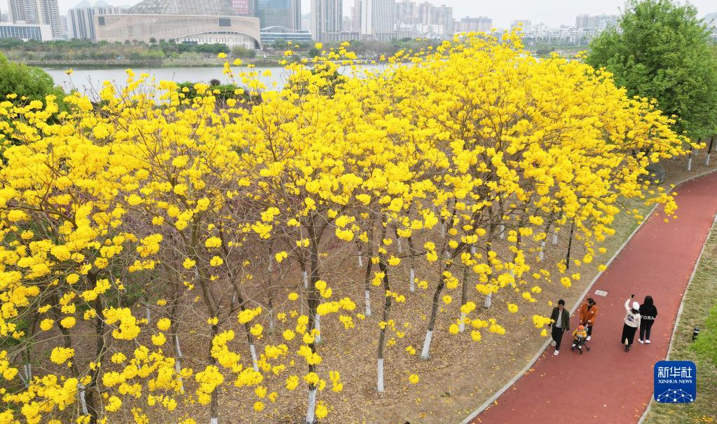 3月18日,游人在廣西賀州市愛(ài)蓮湖公園賞花游玩(無(wú)人機照片)。