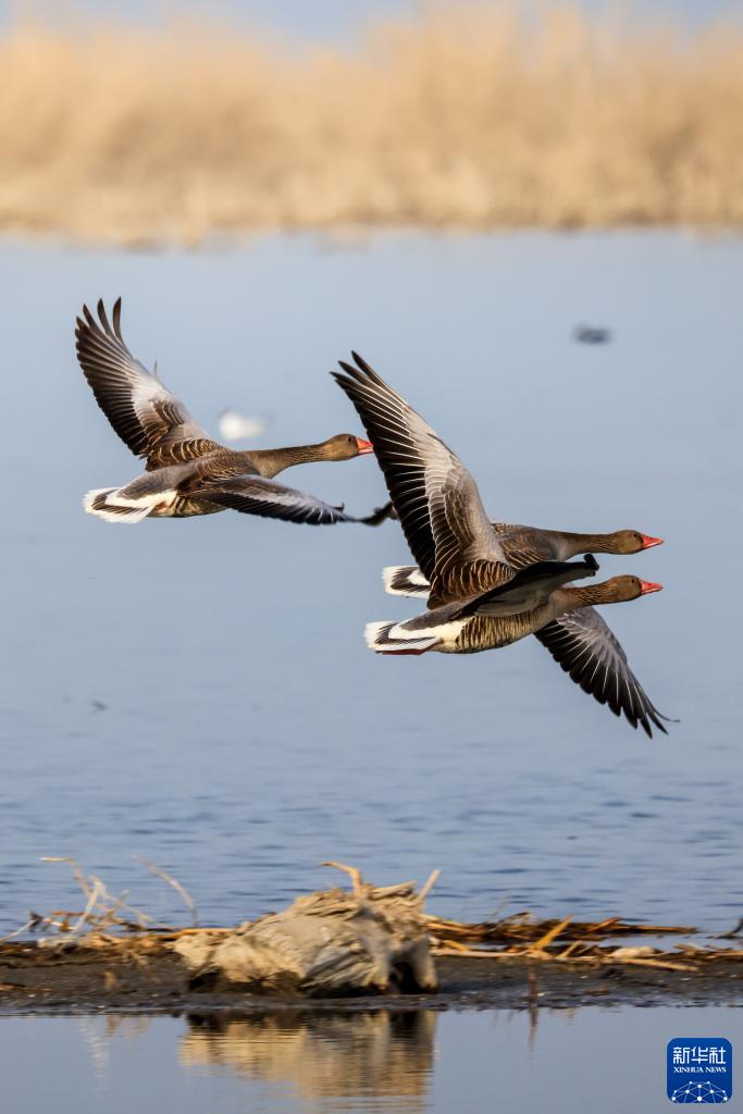 灰雁在新疆博斯騰湖水面上飛翔(3月17日攝)。