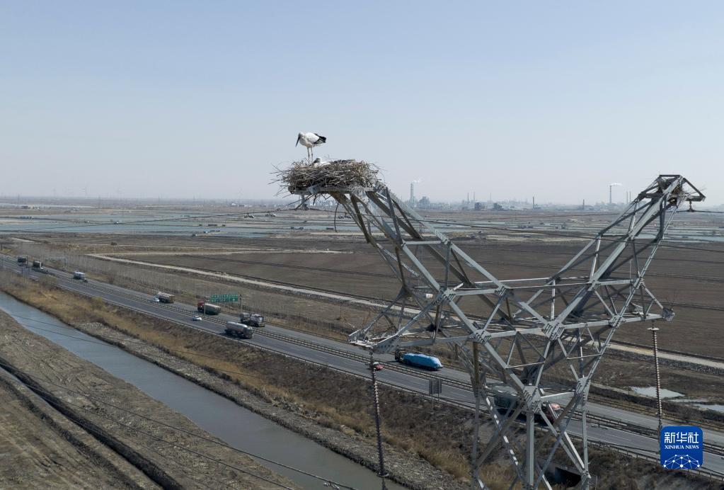 3月19日,東方白鸛在唐山市豐南區沿海濕地鐵塔上的巢穴里(無(wú)人機照片)。
