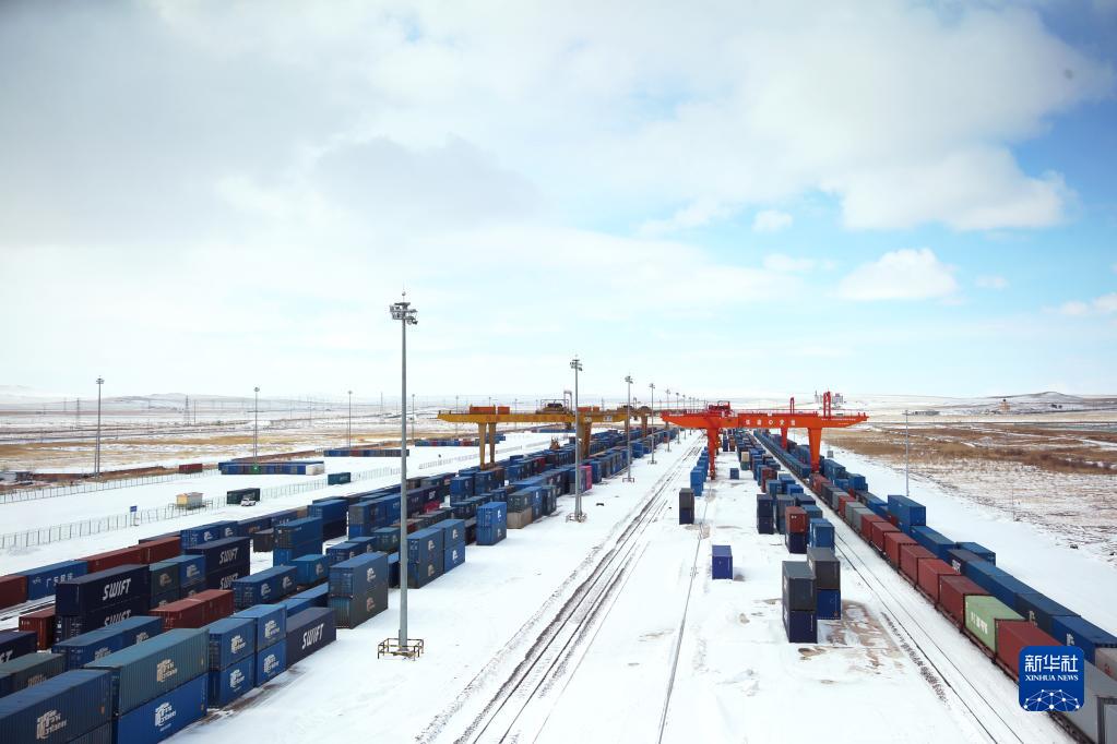 3月15日拍攝的滿(mǎn)洲里站貨運車(chē)間集裝箱場(chǎng),入境中歐班列在此進(jìn)行換裝作業(yè)。