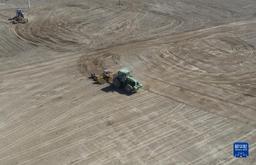 3月19日,在唐山市豐南區西葛鎮東尖坨一村高標準農田建設現場(chǎng),工人使用機械設備平整土地(無(wú)人機照片)。