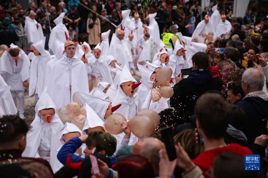 3月19日,在比利時(shí)東部的小城斯塔沃洛舉行的狂歡節游行上,裝扮成“白衣人”形象的表演者用吹起的豬膀胱敲打路人的頭。