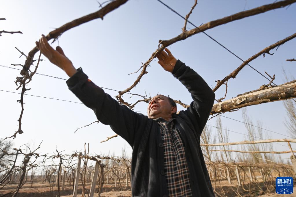 在新疆吐魯番市高昌區葡萄鎮,村民在整理葡萄藤(3月8日攝)。眼下正值春耕季節,吐魯番盆地的葡萄陸續開(kāi)墩,再過(guò)幾個(gè)月,天山雪水就會(huì )經(jīng)過(guò)坎兒井滋潤著(zhù)一片片葡萄田。