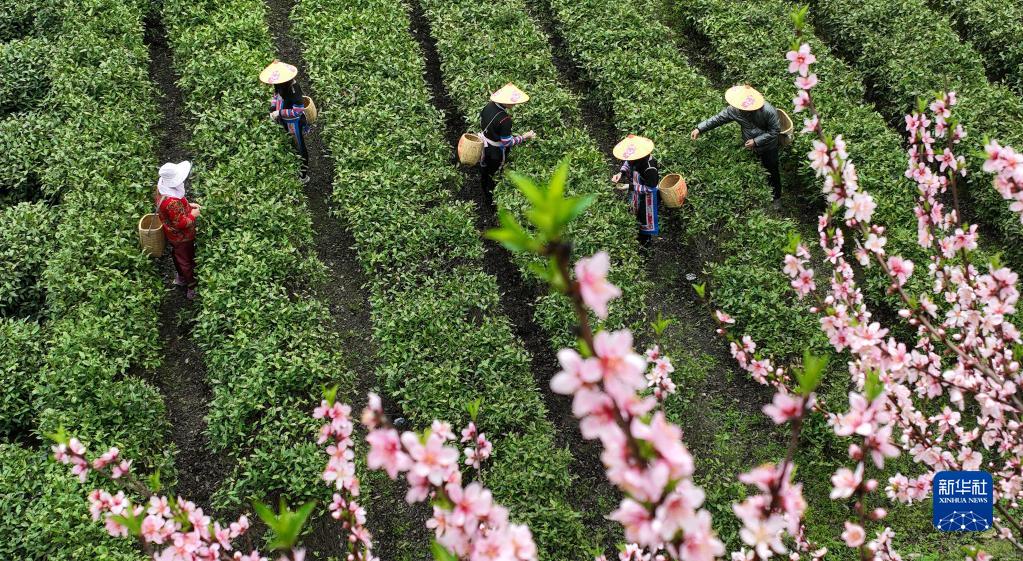 3月20日,在湖南衡陽(yáng)常寧市塔山瑤族鄉,茶農在茶園采茶(無(wú)人機照片)。