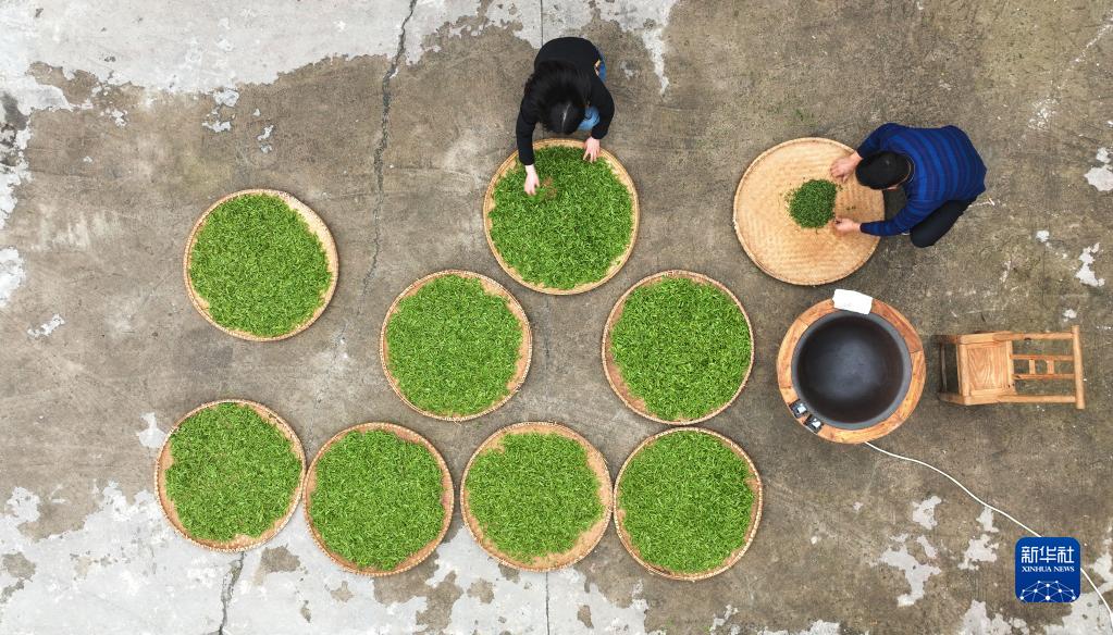 3月20日,在湖南衡陽(yáng)常寧市塔山瑤族鄉,茶農在炒茶(無(wú)人機照片)。