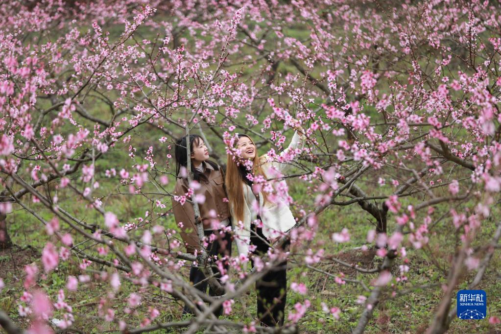 3月20日,游客在貴州省劍河縣岑松鎮塘腳村的桃花園里拍照。