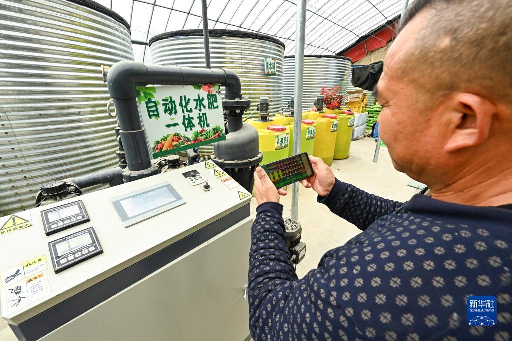 新疆博湖縣現代設施農業(yè)示范基地的管理人員通過(guò)手機控制自動(dòng)化水肥一體機(3月20日攝)。