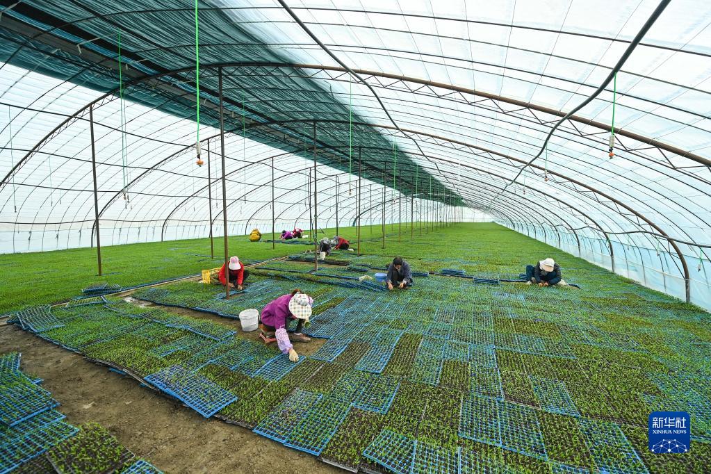 農民在新疆博湖縣本布圖鎮的一處溫室大棚移栽辣椒苗(3月20日攝)。