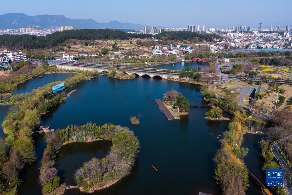 空中俯瞰浙江省金華市金東區嶺下鎮八仙溪及周邊村莊(3月14日攝,無(wú)人機照片)。近年來(lái),嶺下鎮先后關(guān)停沿岸多家制砂企業(yè)及養殖場(chǎng),清理河道垃圾2200多噸,完成28個(gè)村農村生活污水處理工程和51口池塘清淤,2018年以來(lái)八仙溪水質(zhì)常年保持在Ⅱ類(lèi)以上。