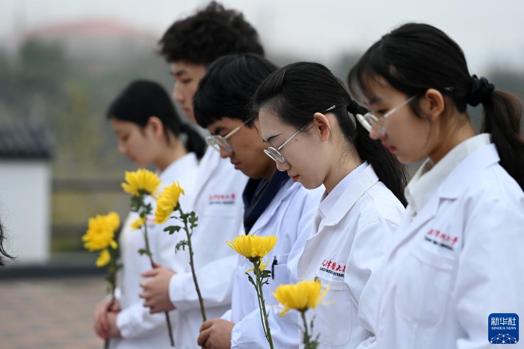 當日,天津醫科大學(xué)組織學(xué)生在位于天津市薊州區的元寶山莊生命紀念公園舉行向遺體捐獻者致敬活動(dòng)。在象征遺體捐獻者的奉獻碑前,學(xué)生代表們通過(guò)默哀、獻花、宣誓和詩(shī)朗誦等形式,表達對遺體捐獻者的緬懷和崇高敬意。